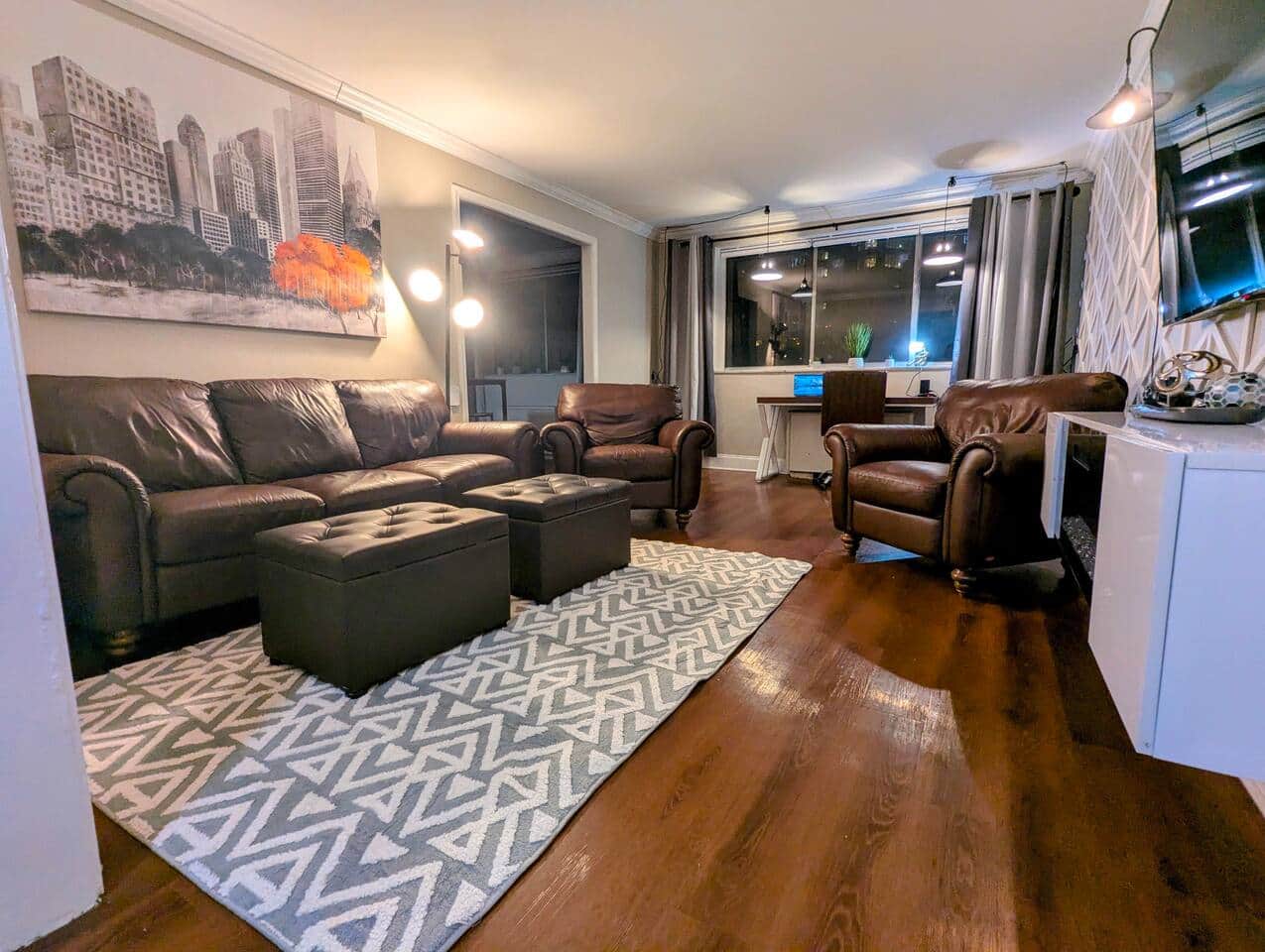 You can relax by the fireplace, enjoy a movie on TV , or work at the desk enjoying a view of the city.